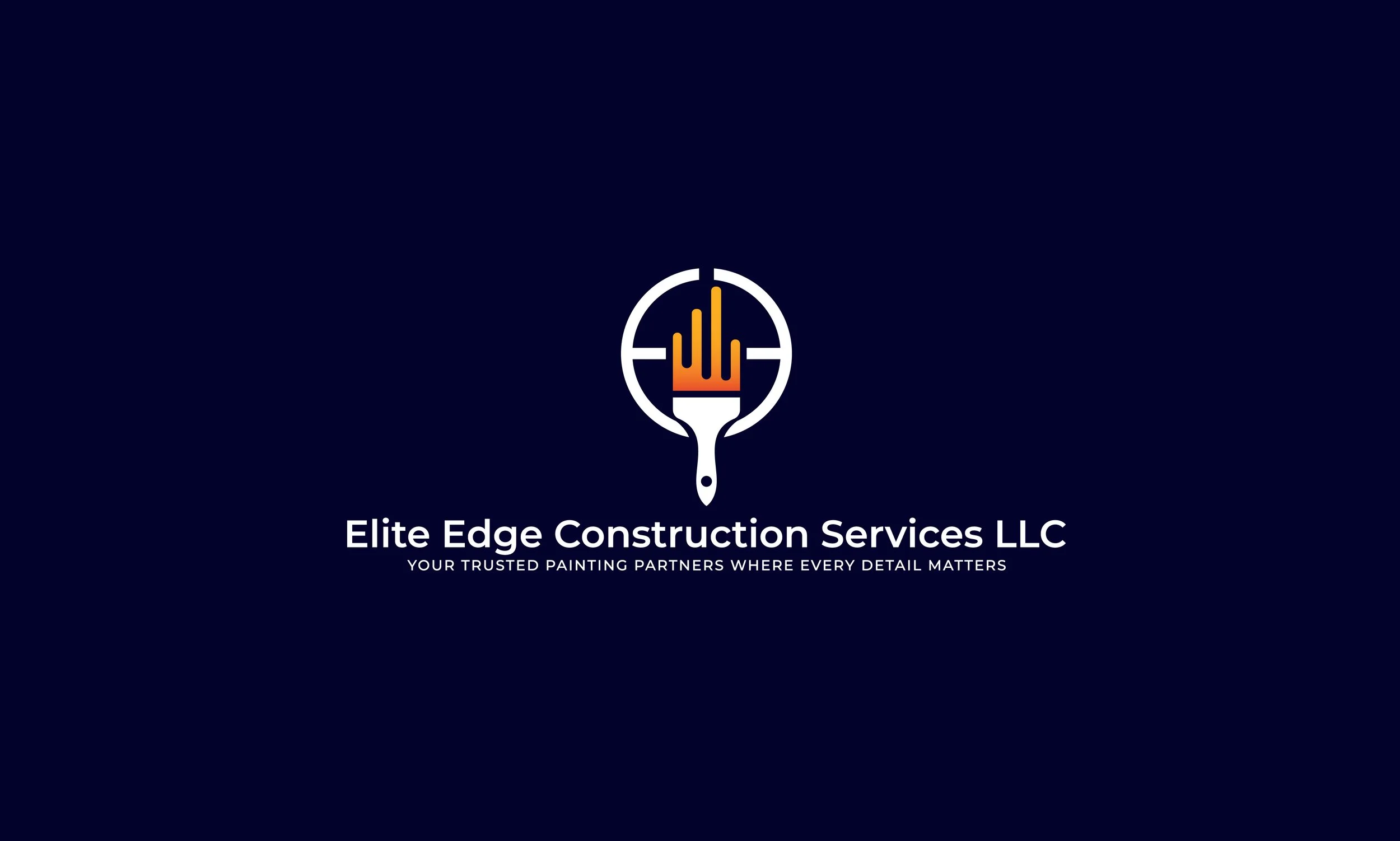 Logo for Elite Edge Construction Services LLC featuring a paintbrush and a target symbol with a paint stroke in orange and yellow, navy blue background, with white text stating the company name and tagline